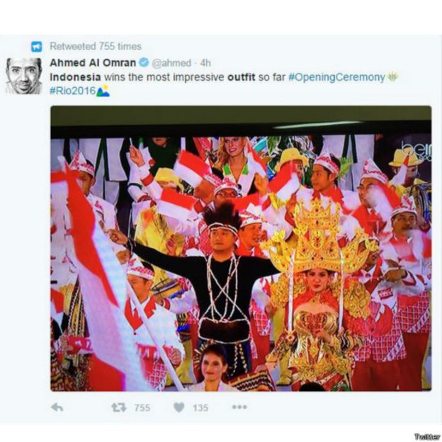 TWITTERAhmed al Omran, koresponden harian Wall Street Journal, menyebut kontingen Indonesia pantas memenangkan kategori pakaian paling mengesankan dalam pembukaan Olimpiade 2016. Cuitan Al Omran di Twitter kemudian dicuitkan kembali sebanyak 976 kali.