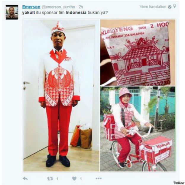 TWITTERPegiat antikorupsi Emerson Yuntho melalui akun @emerson_yuntho mengunggah foto yang menyandingkan pakaian kontingen Indonesia pada Olimpiade 2016 dengan seragam penjual minuman kesehatan dan bungkus penganan ringan.